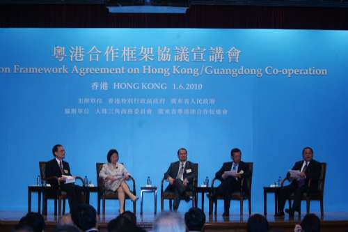 今年四月初,曾蔭權(quán)和黃華華等粵港政府高層,在習(xí)近平等中央領(lǐng)導(dǎo)人見證下,簽署《粵港合作框架協(xié)議》,揭開粵港緊密合作新篇章。昨日兩地政府再度連手,共同主辦宣講會(huì),意在向社會(huì)各界講解《框架協(xié)議》對兩地合作提出的六個(gè)明確定位和分工,以及兩地如何通過功能互補(bǔ)、協(xié)調(diào)發(fā)展,共同提升整個(gè)區(qū)域的綜合競爭力,以期讓各界更能掌握《框架協(xié)議》的機(jī)遇。