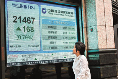 中新網10月14日電 據香港《文匯報》報道,外圍造好,港股13日曾升過379點,但午后高位遇阻力,急劇回調逾200點,從高位21679點,收窄至21467點才報收,全日升168點,成交604億元。