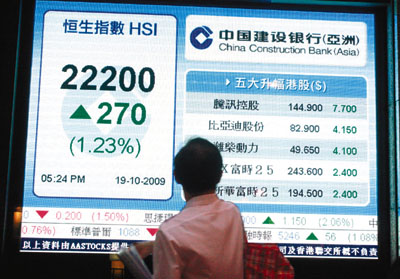 中新網(wǎng)10月20日電 據(jù)香港《文匯報(bào)》報(bào)道,港股19日低開(kāi)后回升,隨內(nèi)地股市午后升幅擴(kuò)大,港股也跟隨,曾經(jīng)升過(guò)逾300點(diǎn),全日升270.5點(diǎn),收?qǐng)?bào)22200點(diǎn),是逾14個(gè)月以來(lái),恒指首次站在22000點(diǎn)之上收市,但全日成交減少至610億元。