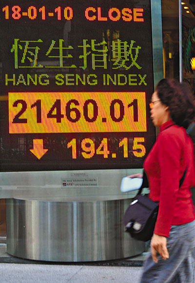 中新網(wǎng)1月19日電 據(jù)香港《文匯報(bào)》報(bào)道,承接美股弱勢(shì),港股18日低開227點(diǎn)后,最多跌過334點(diǎn),其后在中資金融股反彈下,下午跌幅進(jìn)一度收窄至不足10點(diǎn),但其后跌幅再擴(kuò)大,最終收?qǐng)?bào)21460點(diǎn),跌194點(diǎn),總成交695億元,是連續(xù)5天跌市,全日高低波幅325點(diǎn)。