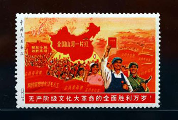 由北京郵票廠印制,面值8分的“全國山河一片紅”,小幅郵票圖案為工農兵手持《毛主席語錄》,背景中“革命委員會”的紅旗以及工農兵群眾熱烈歡呼的場面匯成紅色海洋,畫面上方為一幅中國地圖,地圖上除臺灣省外全部繪成大紅色,并印有“全國山河一片紅”金字,而大幅的“一片紅”畫面內容與小幅的相似,下書“無產階級文化大革命的全面勝利萬歲!”