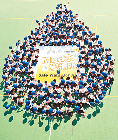 其中祖堯天主教小學19日率先揭開“改變世界我可以!”大行動的序幕,約200名學生手持藍色氣球,于學校操場以身體砌成“Mud水變清水”的水滴點,并高呼“改變世界我可以!”的口號,以表達對貧困國家兒童飲用清水的關注及身體力行改變世界的決心。