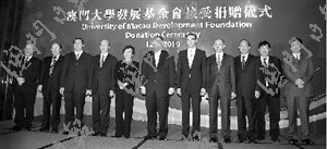 澳門大學發展基金會接受捐贈儀式昨晚舉行,行政長官崔世安,社會文化司司長張裕,澳門教區主教黎鴻升,澳大發展基金會創立人代表、信托委員會副主席謝志偉,澳大校長趙偉,副校長何順文、馬許愿及黎日隆等政府官員、澳大領導及社會人士出席。