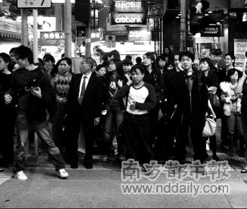 3月13日,香港彌敦道等待過街的人群。雖然流感蔓延全港,但香港市民并沒有恐慌感。(圖片來源:南方都市報 劉可攝)