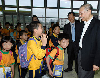 圖:香港教育局局長孫明揚在羅湖與跨境學童交談。(圖片來源:香港特區政府網站)