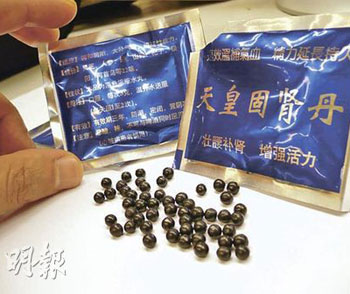 其中聲稱“1粒OK 三天有效……可增長陰莖”的壯陽藥“男根增長素”,因非法含有昔多芬及格列本脲,除在香港導致一名老人昏迷外,也曾在內地多個省被政府查禁。