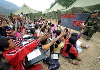 聚源中學的學生在復課日里起誓,說要安心學習,回報社會。北川中學高三學生劉倩在日記中寫道:“我們有義務與責任盡自己所能去重建我們的家園。請重新樹立起信心吧,中華民族從來都是打不垮的,中國人民從來都是不屈不撓的,我們已經與死亡握過了手,我們還有什么可畏懼的呢……讓我們互牽友愛的手,用愛去敲響我們的未來……請相信災難后的我們會是永遠的勝利者!庇纱耍浾呖匆姡錆M希望的未來正在讀書聲中醞釀誕生。