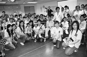 圖:代表團(tuán)一行與在穗治療的災(zāi)區(qū)兒童合影。(圖片來源:澳門日?qǐng)?bào))