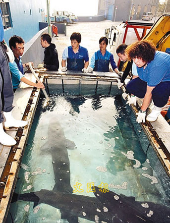 兩尾中華鱘因病被送返福建治療,料3個后才能重返香港海洋公園。圖為海園工作人員當日準備將中華鱘運走。(圖片來源:文匯報)