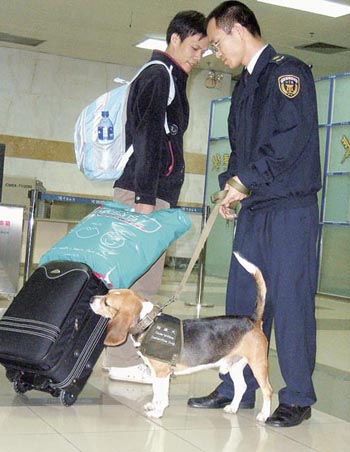 目前,廣東共有17只檢疫犬,分別駐守各關(guān)卡口岸,包括中山、順德、東莞、天河和番禺各2只;機(jī)場(chǎng)有6只;余下1只則在廣州站郵件辦事處執(zhí)勤,全屬比格犬。順德出入境檢驗(yàn)檢疫局長(zhǎng)何偉棠說(shuō),他們選用比格犬,而不像北京選用拉布拉多犬,是考慮到上述口岸老少人流多,由體積較少較親民的比格犬執(zhí)勤較合適。