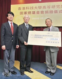 據(jù)香港媒體報道,田家炳基金會捐款300萬元給科大高研院,加上政府的配對基金,成立600萬元的“田家炳教育基金”。基金會主席田家炳、科大校董會主席陳祖澤及校長朱經(jīng)武11日出席了捐贈鳴謝儀式。
