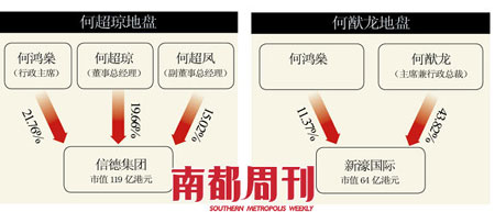 何鴻燊旗下的商業王國中,以信德集團最為實業化,經營房地產、酒店及運輸等業務,由二太太長女何超瓊任董事總經理,二太太三個女兒也占股權共37%,是名副其實的大股東;二太太長子何猷龍擔任董事長的新濠國際,何鴻燊所占股份也低于兒子。