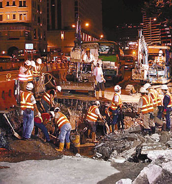 港鐵九龍南線工程地盤出現沉降,這是該項工程至今第3次地陷。圖為去年梳士巴利道路面沉降,工人在場搶修。 文匯報圖
