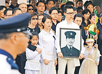 資料圖:香港尖沙咀槍擊案殉職警員曾國恒,以警隊(duì)最高規(guī)格舉行喪禮,儀式于世界殯儀館舉行,由曾國恒生前的同袍扶靈。 中新社發(fā) 譚達(dá)明 攝