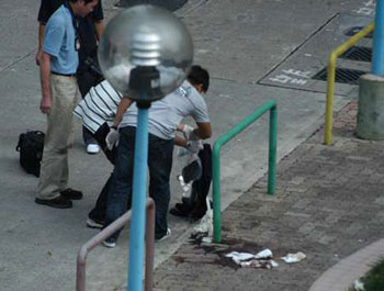 據悉,有人不甘被包圍,曾低聲稱“你有槍,我沒有。”最后,青年終棄械投降,被警員鎖上手銬,由救護員剪爛其褲管為他止血,然后送往瑪嘉烈醫院救治。現場留下大灘血漬。