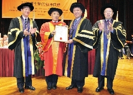 何厚鏵向李肇星頒授榮譽人文博士學位。(圖片來源:澳門日報)