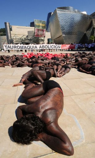 周末的抗議活動(dòng)由國際動(dòng)物保護(hù)團(tuán)體策劃,抗議者在身上涂上紅色顏料,象征鮮血,倒臥地上排成牛只的圖形,并大聲疾呼,效法加泰羅尼亞地區(qū)禁止斗牛。