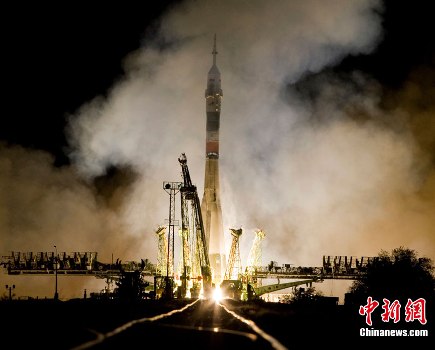 電視畫面顯示,該枚宇宙飛船用火箭從哈薩克斯坦境內(nèi)的拜科努爾人造衛(wèi)星發(fā)射基地發(fā)射升空,據(jù)報(bào)道,飛船將搭載3名宇航員前往國(guó)際空間站。宇航員中包括美國(guó)和俄羅斯宇航員。