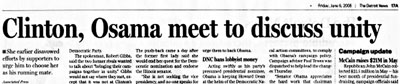 中新網6月8日電 美國前日出版的報章《底特律新聞》,約4.5萬份報紙的17A頁上,標題寫錯成《希拉里、奧薩瑪會面商團結》(見圖),把民主黨總統選舉準候選人奧巴馬(Obama)的名字,錯拼做“基地”恐怖組織領袖奧薩瑪(Osama)•本•拉登。