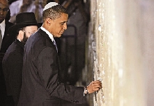 據香港《文匯報》報道,哭墻有2000年歷史,是猶太教的圣地,不少人都會把寫著禱文的紙條塞進石縫。奧巴馬會晤以色列和巴勒斯坦自治政府的官員后,周四凌晨戴著卡巴頭飾到訪哭墻,留下紙條,之后便垂下頭,作為敬拜。