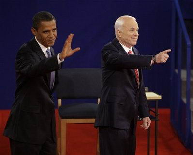 麥凱恩和奧巴馬在第二場辯論前向觀眾揮手致意。