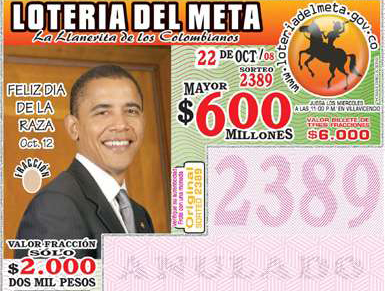 中新網10月24日電 綜合報道,美國總統大選進入最后沖刺階段,民主黨總統候選人奧巴馬各項民調持續領先,大有直取白宮之勢。奧巴馬在海外的人氣也是比許多人想象中更強勁,哥倫比亞一個城市便把奧巴馬的肖像印在了所有彩票上。
