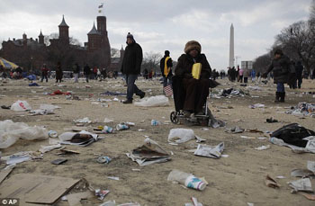 日前美國將使用衛星在空中拍攝到華盛頓國家廣場照片,和奧巴馬總統就職后的進行對比。從照片上可以看到在就職典禮當日,國家廣場上覆蓋了白色垃圾,這些垃圾大部分是宣傳紙、報紙、塑料瓶子、食物包裝紙、一次性咖啡杯,甚至還有美國國旗。