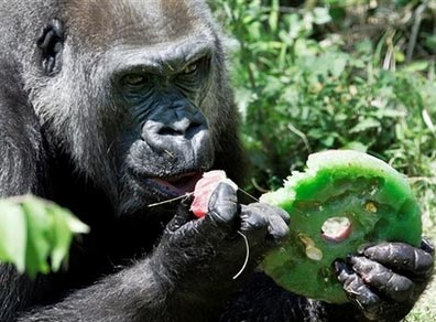 5月8日,美國(guó)達(dá)拉斯沃思堡動(dòng)物園的工作人員為目前在世的世界上年齡最大的猩猩慶祝55歲生日。工作人員將一塊四層的冰凍水果蛋糕和香蕉葉包裹的甜點(diǎn)作為生日禮物送給這位“老壽星”。
