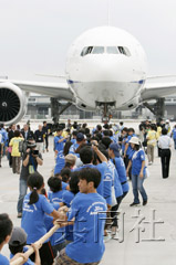 家長們加入進來后機體才稍稍移動了數(shù)米,大家頓時擊掌歡呼。來自千葉市的小學(xué)二年級學(xué)生堀江昌大(8歲)睜大眼睛說,“手很痛,看到飛機真的動了大吃一驚”。