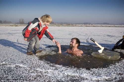 裸體站立冰中與小朋友輕松握手