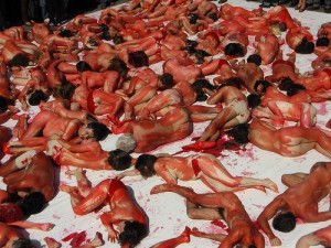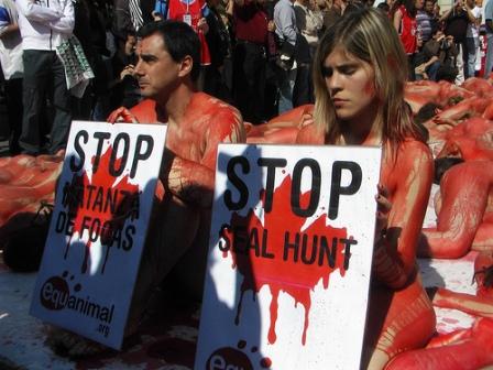 示威者在身上涂上紅色顏料,裝扮成被獵殺的海豹,抗議捕殺海豹。