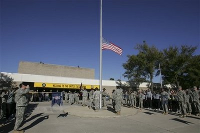 奧巴馬并下令即日起到11日退伍軍人節(jié)為止,白宮和其它聯(lián)邦機構(gòu)降半旗向受難者致哀。他說,這是對那些正準備為國家冒生命危險卻喪命的人的最起碼敬意。