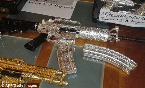 據報道,這些槍支顯示了幫派奢華份子如何花用他們不法的財富。照片顯示軍方在墨西哥西部一次突擊行動中,起出31支槍,大部分外表都包覆著黃金或白銀外皮,或鑲嵌著許多閃閃發光的鉆石。