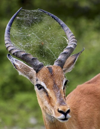 所羅門說,羚羊肯定是在公園里游逛時(shí),無意之中兩角掛到了懸在某處的蜘蛛網(wǎng),并將網(wǎng)和蜘蛛一同載走,一直掛在角上。