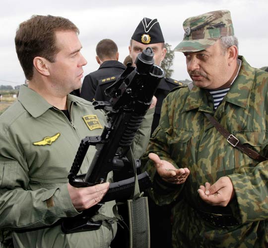 據(jù)英國(guó)《每日電訊報(bào)》28日?qǐng)?bào)道,近日,俄羅斯正同白俄羅斯在加里寧格勒地區(qū)展開(kāi)聯(lián)合軍事演習(xí)。俄羅斯總統(tǒng)梅德韋杰夫也身著軍裝出現(xiàn)在演習(xí)現(xiàn)場(chǎng),他甚至端起一把機(jī)槍,并且用雙筒望遠(yuǎn)鏡觀看演習(xí)情況,展現(xiàn)自己的硬漢形象。