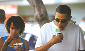 果然,美國總統這次又選擇了這種混合檸檬、櫻桃以及熱帶水果糖漿的刨冰,沒有再加紅豆和奶油等點綴。“我喜歡直接吃這種冰,不需要其他裝飾,”奧巴馬指著菜單上的“雪巴馬”字樣笑著告訴記者。