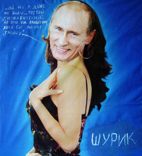 普京一向以“硬漢”形象示人,如今一個心懷不滿的畫家,竟然將這個“硬漢”畫成一個身穿低胸吊帶緊身裙,擁有一頭波浪長發,并戴著大耳環的女人。這名畫家已經被俄羅斯秘密警察拘捕。對于自己涉嫌羞辱總理的行為,該畫家解釋說自己是對普京還想當總統一事表示抗議。