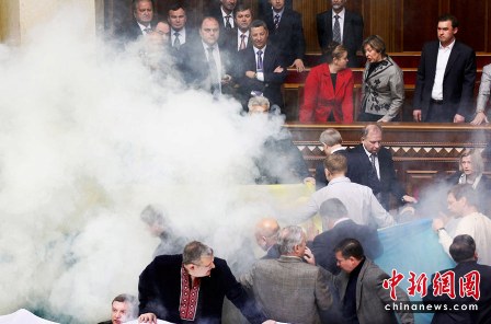 27日,烏克蘭最高拉達召開會議,討論是否通過俄黑海艦隊駐烏克蘭克里米亞半島的租期延期協議,但會議現場一度發生騷亂。議長利特溫被反對派議員用雞蛋打,不得不撐開黑傘躲在后面。現場還發生了肢體沖突,人們扭打在一起,一片混亂。更有人趁亂在議會廳內放置至少二顆煙霧彈,導致大廳被一片濃煙籠罩,大家紛紛捂住口鼻。