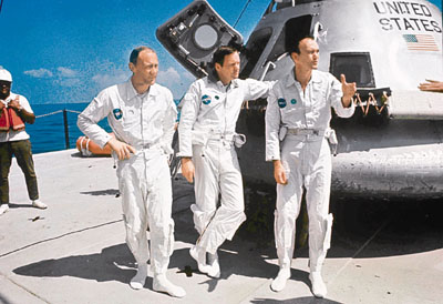 據(jù)香港《文匯報》報道,1969年7月,3名宇航員阿姆斯特朗、科林斯和奧爾德林,擠在“阿波羅11號”里展開他們歷史性的8天旅程。此次紀(jì)念登月40周年,周日3人終于有機會再一同出現(xiàn)在公眾面前,并在華盛頓的史密森學(xué)會國家航空航天博物館發(fā)表演講,一起談?wù)撎諝v史。這或許將是3位年屆8旬的老人,最后一次集體亮相。