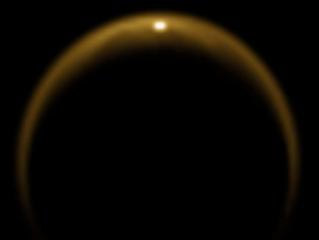 由于土衛六上空厚厚的大氣層的干擾,土衛六表面所反射的太陽光大多數都被遮蔽。“卡西尼號”探測器也是在偶然間拍下了這張罕見的照片。照片拍攝于2009年7月8日。