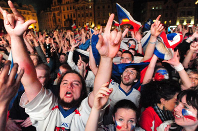 數(shù)千名球迷23日晚上聚集在布拉格市中心老城廣場觀看球賽的電視實(shí)況轉(zhuǎn)播,捷克隊(duì)最終取勝后人們一片歡騰。(黃頻)