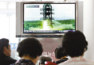 韓國首爾民眾在火車站觀看朝鮮發射火箭的報道。