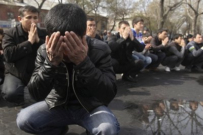 9日,吉爾吉斯斯坦民眾在首都比什凱克掩面祈禱,哀悼騷亂遇難者