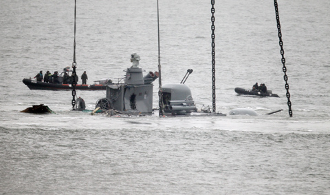 中新網4月13日電 據韓國《朝鮮日報》報道,4月12日下午,天安艦沉沒后的第17天,艦尾終于被吊出水面。海軍方面將艦尾移動4.6公里,移往白翎島沿岸水深較淺的海域。