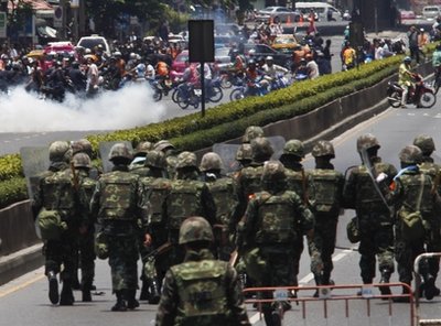 泰國軍隊在包圍紅衫軍的據點后,雙方發生嚴重沖突,軍隊使用實彈射擊。身在現場的記者稱,曼谷市中心的道路上看到燃燒的汽車,聽到槍聲、爆炸聲,天空有直升飛機盤旋,感覺如同戰場一樣。