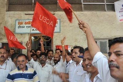 圖為25日,印度航空公司職員揮舞旗幟,對公司表示抗議