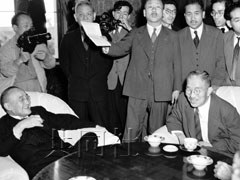 1946年,鳩山一郎在政權唾手可得之際,被盟軍總司令部以戰爭期間曾與軍部合作為由開除公職,吉田茂取而代之做了首相。恢復公職后,鳩山成為逼迫吉田內閣交權的競爭對手。為和致力于日美外交的吉田相抗衡,1954年鳩山就任首相后以自身政治生命為賭注,于1956年實現了日蘇邦交正常化,此事此廣為人知。