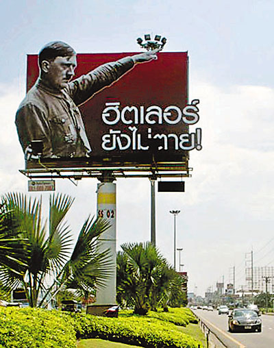 據悉,希特勒廣告牌于兩周前豎起,是為當地路易圖索蠟像館下月開張做的宣傳。該廣告牌位于進入芭堤雅的主要高速路旁,希特勒的畫像與廣告牌上的泰文廣告語“希特勒未死“十分醒目。廣告牌豎起以來,泰國方面已經接到100多宗投訴和德國、以色列等國大使館的抗議信。