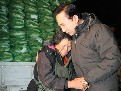 在市場賣蘿卜的一名樸姓奶奶久久地握著李明博的手不放,李明博問她:“一天能賺多少錢?”,樸姓奶奶答說:“平均2萬元左右。生意好的時候,可以賺3萬元。”,接著開始掉下眼淚。