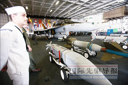 在飛行甲板上,一位名叫馬圭爾的海軍軍官向《國際先驅導報》記者介紹了艦上的艦載機。從EA-6B“徘徊者”電子戰(zhàn)飛機到E-2C“鷹眼”空中預警機,從SH-60“海鷹”直升機到F/A-18“大黃蜂”的各種改進型,他如數家珍。
